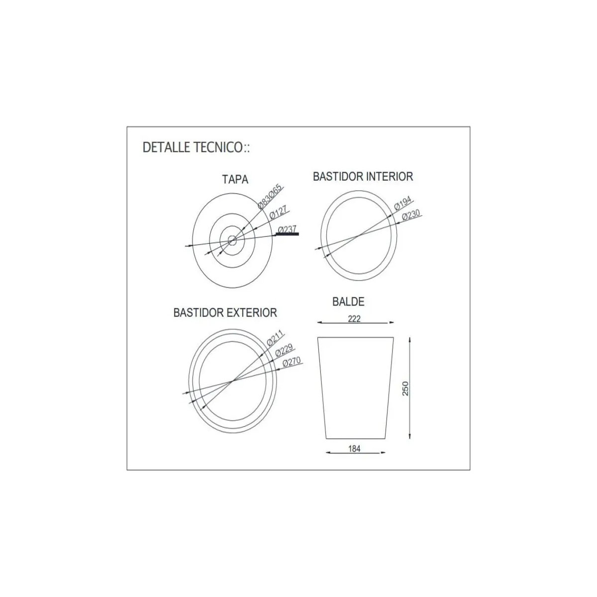 Con un diámetro total de 270 mm, incluye un balde plástico de 8 litros de capacidad que permite un manejo práctico, limpio e higiénico de los residuos.