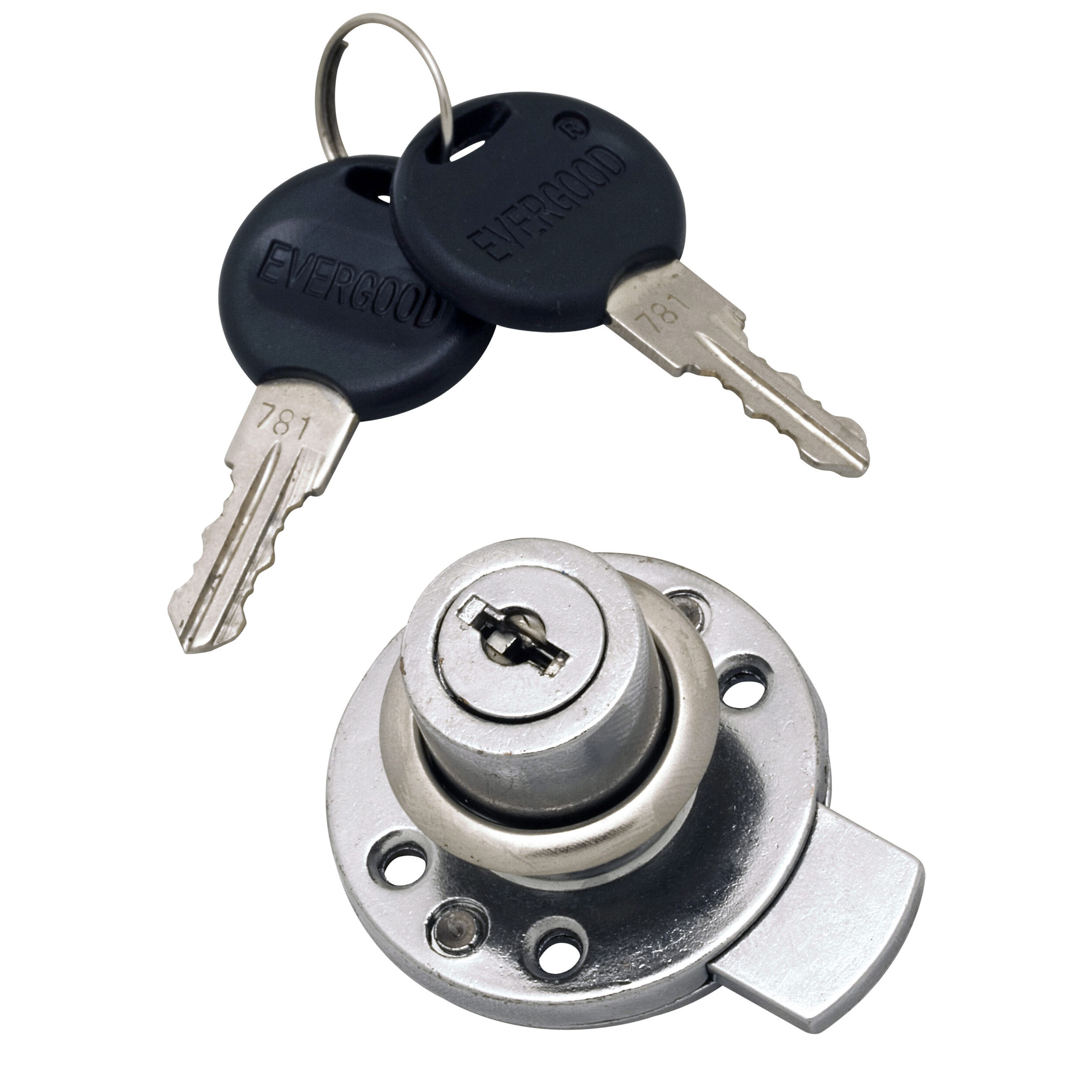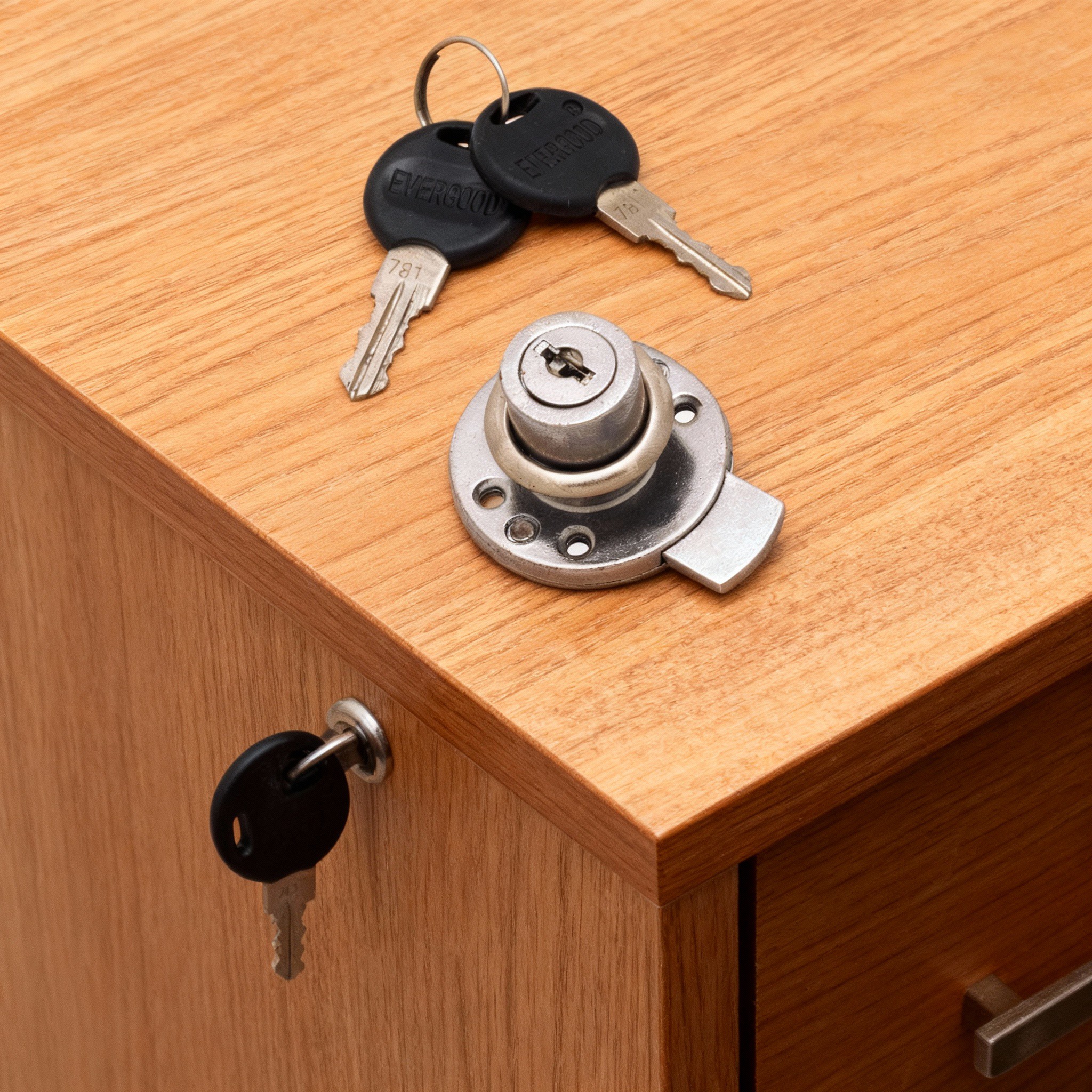 Práctica cerradura metálica de forma redonda, diseñada para instalar en puertas de muebles, escritorios, vitrinas o gabinetes. Ofrece un cierre seguro y discreto, ideal para resguardar objetos personales o documentos. Su diseño compacto y funcional se integra fácilmente en diferentes estilos de mobiliario, aportando seguridad sin alterar la estética del mueble.