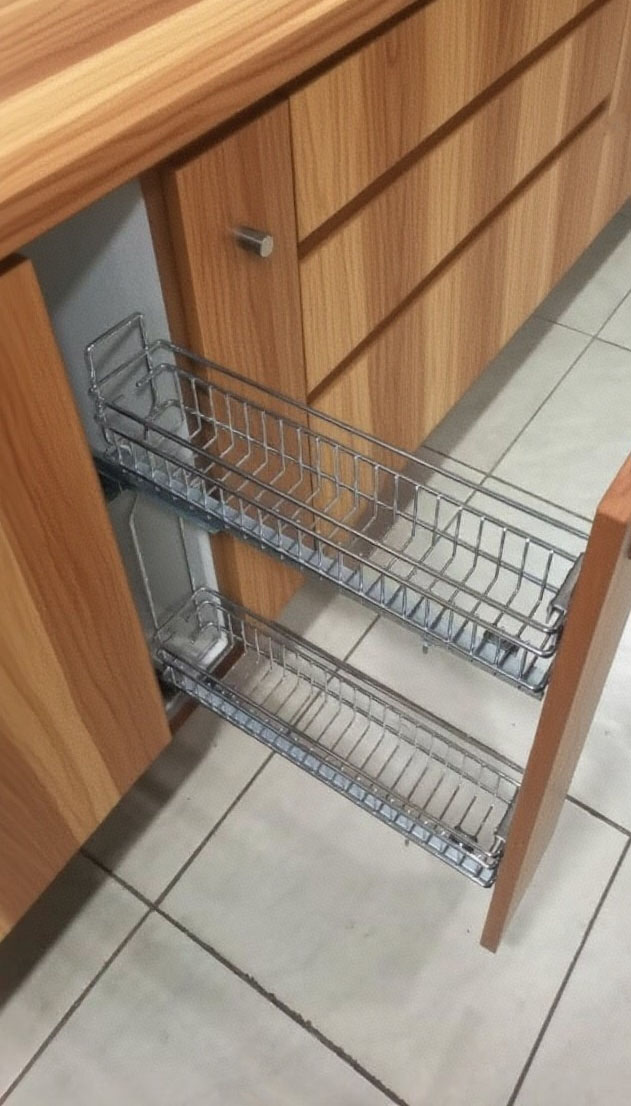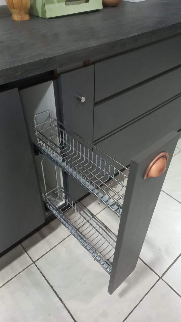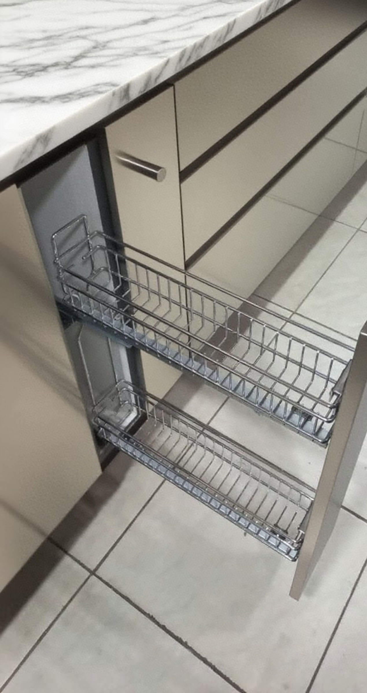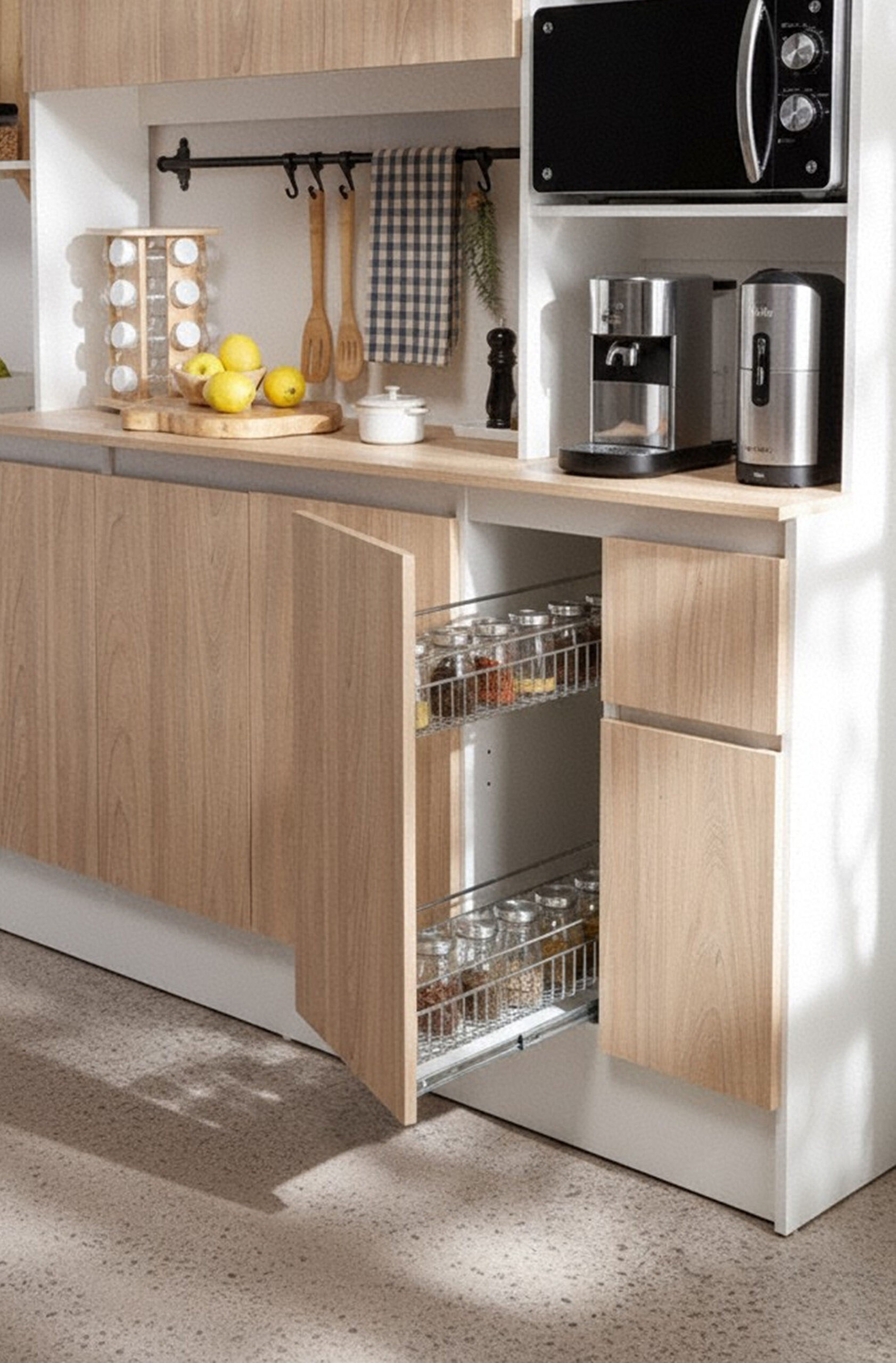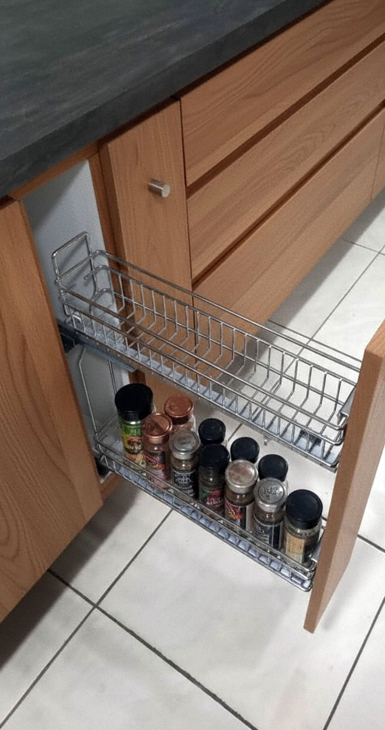 Optimiza tus muebles de cocina con este especiero de 150 mm de ancho, diseñado para aprovechar al máximo los espacios reducidos. Su sistema de correderas ocultas con cierre suave garantiza un deslizamiento silencioso, fluido y seguro, evitando golpes bruscos al cerrarlo. Ideal para organizar frascos de especias y pequeños envases, manteniéndolos siempre accesibles y ordenados. Fabricado con materiales de alta calidad, ofrece resistencia, funcionalidad y un acabado moderno que se adapta a cualquier estilo de cocina.